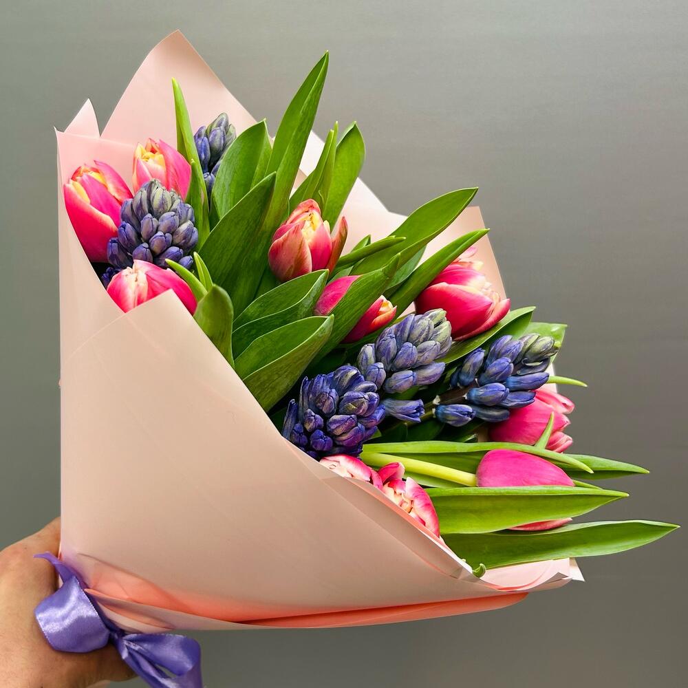 Весенний букет из тюльпанов и гиацинтов